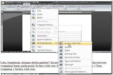 - Lalu, bagaimana dengan daftar gambar? Ini pun tidak sulit. Posisi gambar (layout/text Wrapping) harus pada posisi In line with text. Kalau belum, bisa klik kanan > Text wrapping > In line with text.